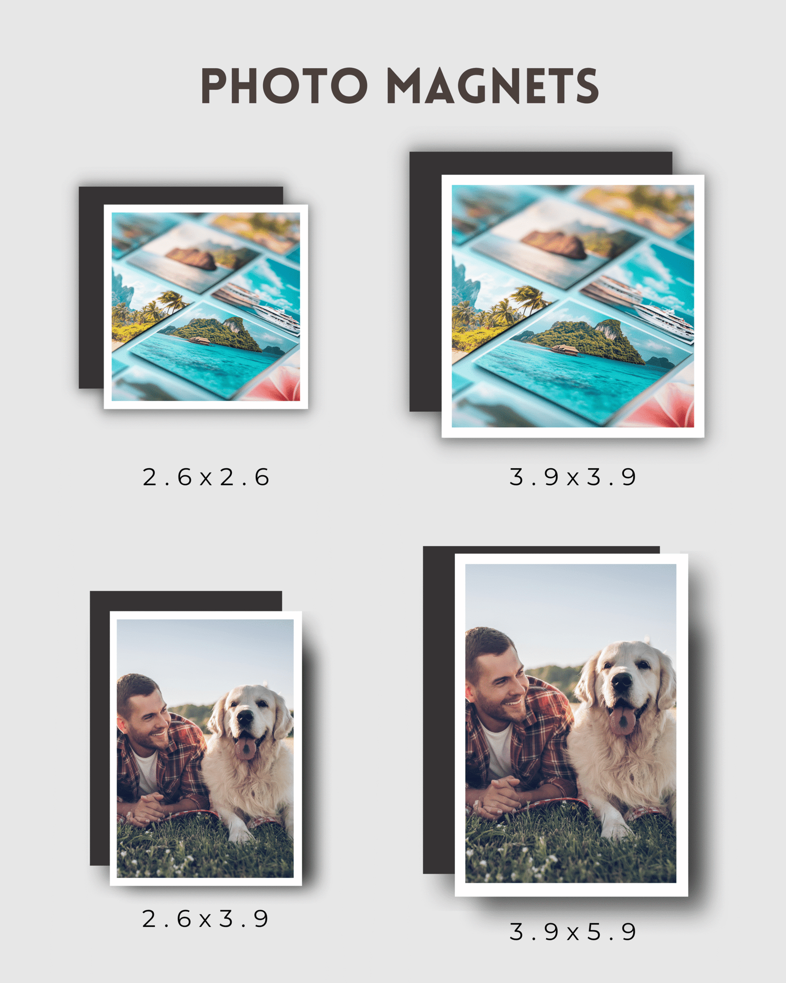 Printed on premium photo paper and mounted onto a durable 0.5mm magnetic sheet, these custom magnets bring your personal memories to life. Choose from: